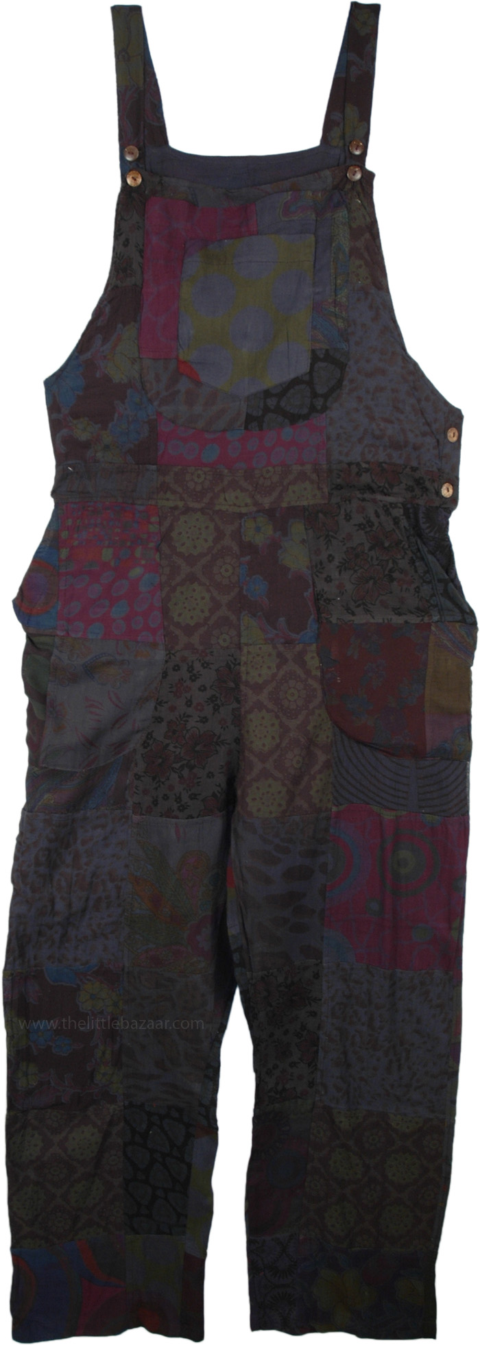 Cotton jumpsuit dungarees with bib pockets in the front and side, handcrafted in darker color patchwork of assorted prints. Soft, slouchy style features adjustable button shoulder straps. Our unique overalls are the perfect fit to show that you are individualistic and trendy. The length is adjustable up to 4 inches with the 3 different buttonholes on the straps and it has 2 functional pockets. These overalls can be worn with simple tank-top, t-shirt, or turtleneck, making them perfect for rain or shine. Pajama style street wear featuring a breezy fabric to keep your skin refreshed on the hot days. With these sweet overalls, you add a dash of bohemian spirit to your everyday life. The length given is measured from shoulder to ankle. Short inseam accords sizing flexibility with the dungaree design. Half elastic at the back of the waist offers flexibility.