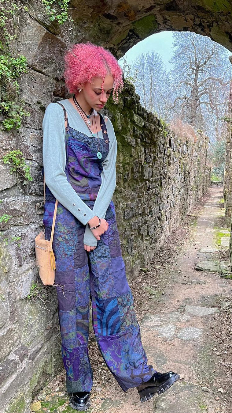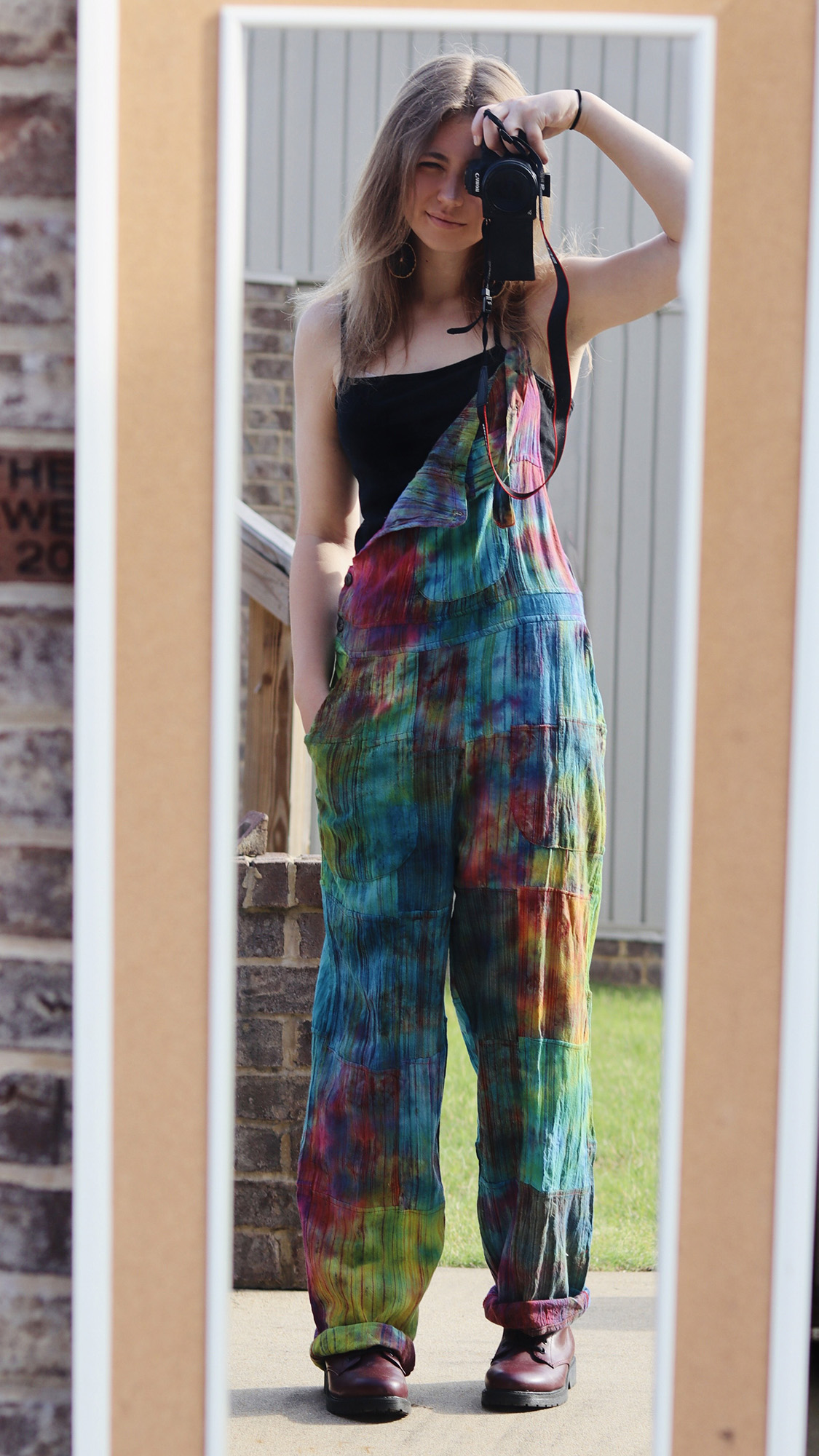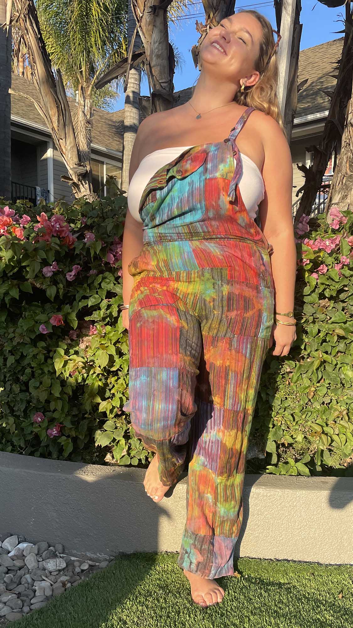 Cotton jumpsuit dungarees with bib pockets in the front and sides, tie-dyed in vibrant blue and yellow splashes. Soft, slouchy style features adjustable button shoulder straps. Our unique overalls are the perfect fit to show that you are individualistic and trendy. The length is adjustable up to 4 inches with the three different buttonholes on the straps, and it has two functional pockets. These overalls can be worn with a simple tank top, t-shirt, or turtleneck, making them perfect for rain or shine. Pajama-style streetwear features a breezy fabric to refresh your skin on hot days. With these sweet overalls, you add a bohemian spirit to your everyday life. The length given is measured from shoulder to ankle. Short inseam accords sizing flexibility with the dungaree design. Half elastic at the back of the waist offers flexibility.