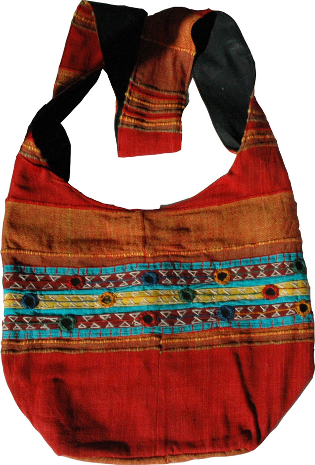 | Item Style | Casual Shoulder Sling Bag | | Surface | Hand Embroidery and Mirrors (see picture below) | | Material | 100% Cotton | | Colors | Red and Orange with other colors. | | Measurement | Depth 11" width 14". Strap is 40" long and 3" wide | | More details | There is similar patchwork and embroidery on the front and back . It closes with a zipper on the top. Inner lining on the entire purse is black cotton. | |