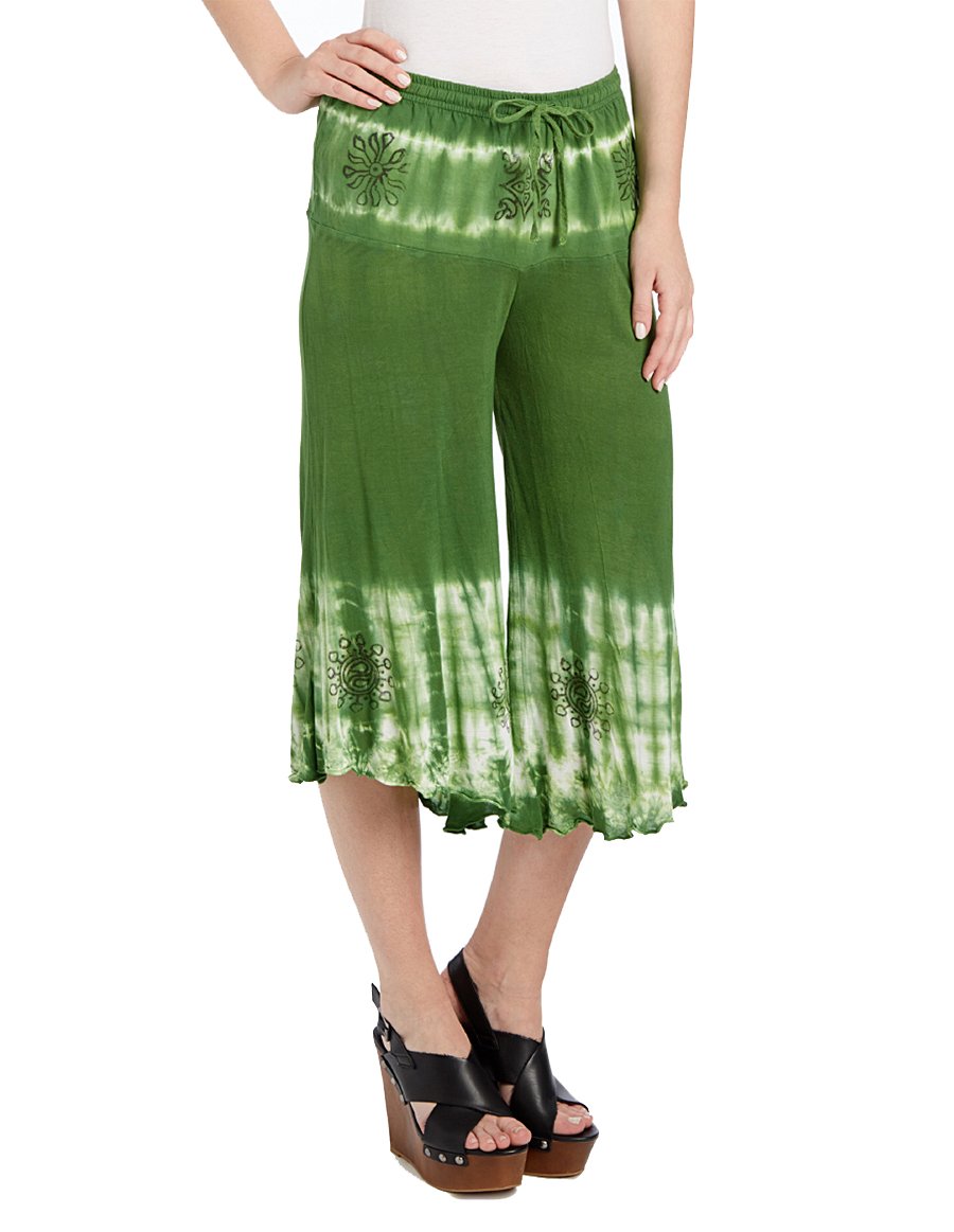 Elastic waist capris in soft t-shirt style jersey cotton fabric are perfect for summer rendezvous and beach vacations. The beautiful fern green color with white tie-dye effect gives it a nice summer vibe. Traditional block print around the waist and the lower part of these casual capris give them an eastern look. Easy pull-up style with flexible elastic waist.