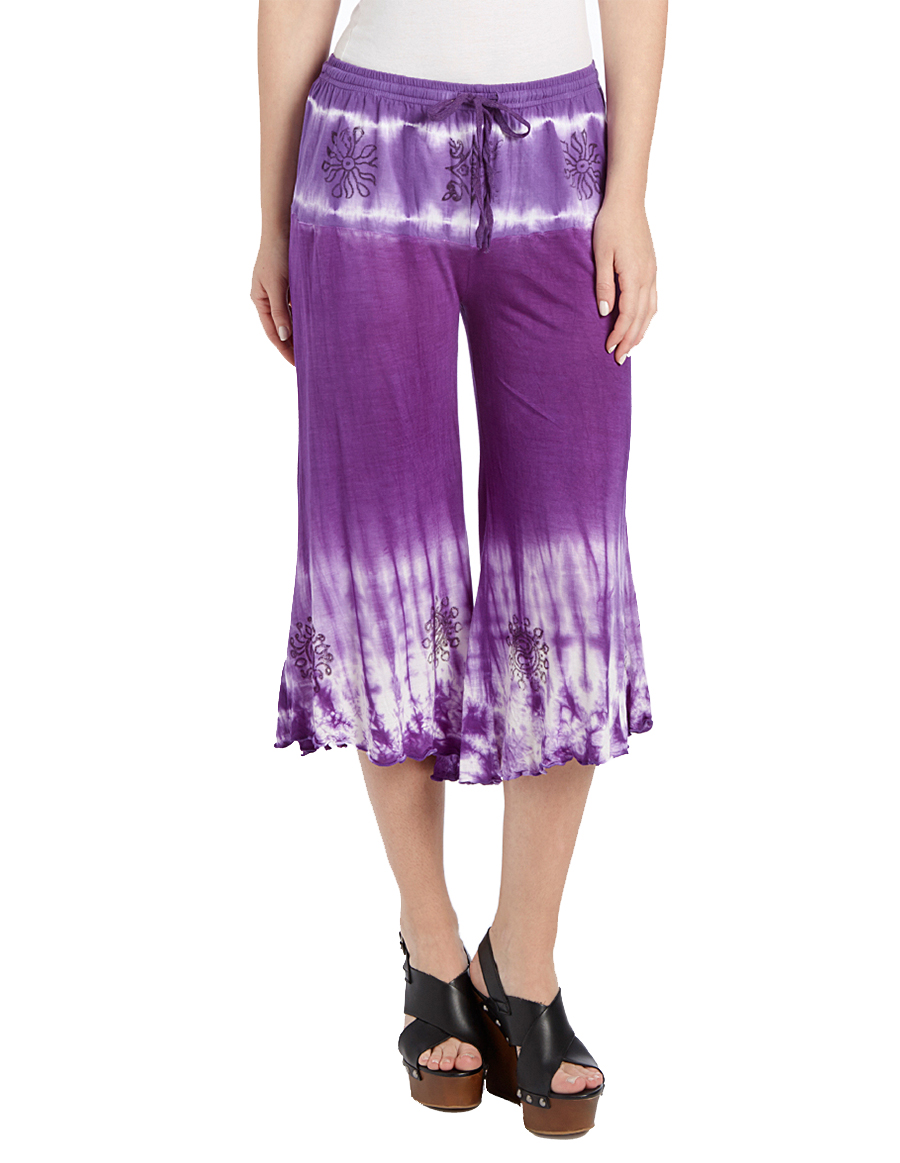 A simple and chic pair of hippie pants in lightweight and soft fabric for summer. These purple bohemian palazzo pants in jersey cotton with white tie-dye effect and floral designs are ideal for yoga classes or beach vacations. The waist has an elastic and drawstrings for a comfortable fit. You can pair it with a simple tank top or a crop top for a cool boho look.
