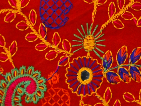 A mid sized trendy red hobo bag with multicolored embroidery (including some mirrors) and made of gheri handloom woven cotton from the himalayas. The square messenger bag closes with a zipper, and has a zipper pocket in the front, and another pocket inside. Back side is all gheri material. Makes an ideal back for outings, hikes, or beaches and travel. Or just carry in around casually across your chest. Looks great with jeans.