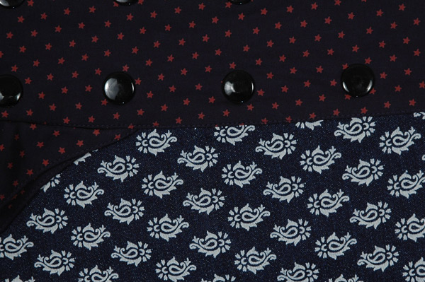 This modular reversible mini skirt is constructed from durable, wrinkle-resistant cotton featuring interchangeable components for multiple styling options. The system combines a burgundy polka-dot base with a navy floral print waistband featuring white botanical motifs and detailed leaf patterns. The removable waistband utilizes a zip mechanism, enabling four distinct looks by swapping elements. The detachable pouch functions as storage, a crossbody accessory, or a belt attachment on pants loops. The unzipped waistband converts to an independent belt.