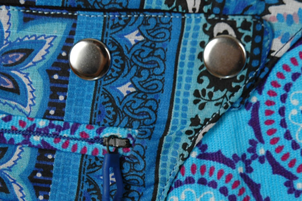 Sky and Navy Blue Corduroy and Cotton Prints and superb build quality will make this short wrap skirt give high-end fashion brands a run for their money. It has a snappable pocket pack and reverses into a contrasting print. A great modern style where the buttons give some amount of sizing flexibility and this mini skirt for the modern fashion lovers has a really cool pocket pack snapped that can be snapped in and out when the skirt is worn reversed. The pocket pack has a zipper and a flapped pocket that is functional, and easy to use to carry small personal items. The contrasting blues combinations are fashionable and a perfect stand out this season. The fabric has tufted cords. A great skirt, and you`ll love the quality of the fabric in person!