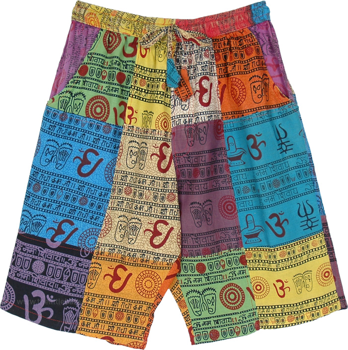 A cool pair of Om printed long knee length shorts, these multicolored shorts with pockets can be worn both by men and women. They are made from assorted Om, the primordial sound of the universe, printed fabric in different colors, giving a old school hippie vibe. The waistband features elastic and drawstrings for comfort to wear. These lightweight cotton summer pants are ideal for summers and can be paired with a variety of t-shirts.