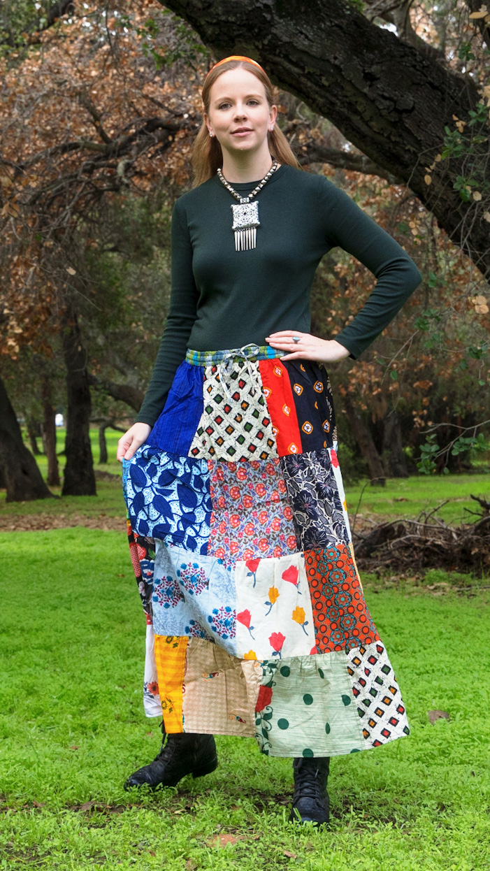 A mixed patchwork cotton skirt with various floral and geometric prints, full maxi length with an elastic waist and drawstring. The elastic waist adds comfort and stretch and drawstring gives you sizing flexibility and a confident fitting. The exquisite unique prints give the skirt a happy and charming feel and makes it an ethical choice that you can add to your skirt collection. Patchwork skirts are often similar and yet each is unique and one of a kind; no two are exactly the same. Pair it with a solid top and add some jewelry for a pure bohemian style. This skirt is not lined.