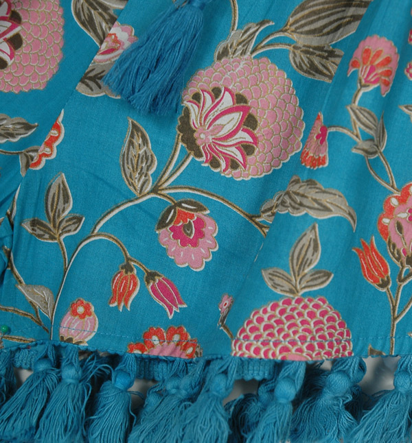 Teal blue bohemian cotton shorts with a beautiful pink floral print. The shorts have a smocking elastic waist with a drawstring featuring tassels at its ends, and pockets on both sides. The bottom of the shorts also has similar tassels for a funky bohemian look. These shorts are super soft and very comfortable, with a cool bohemian vibe.