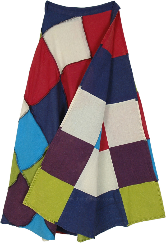 A colorful, creative and crisp wrap around patchwork skirt with a bohemian gypsy look. The patches are chosen carefully to create a color block pattern. The colors used are red, blue, turquoise, off-white, wine and lime. The unique feature of the skirt is that it's reversible, so wear it according to your mood and style. One side of the wrap has a inside out hem on the individual patches and the other side does not. The wrap style of the skirt makes it easy to wear. Top it with a sexy cami and it gives you a designer flair with distinctive elegance or you can wear it with a variety of different colored tops. Wear jewelry to enhance your bohemian look.