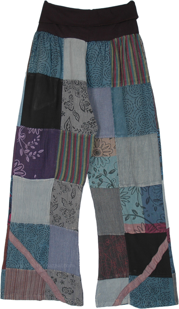 Hippie style street-wear cotton patchwork pants with pockets on either side. The color tone of these pants is mainly grey and blue, but also has some black and purple on some patches. The pants has a flexible yoga waist that can be folded down to fit the waist, low or high waisted. The cool thing about these pants is that the length can be adjusted by folding the yoga waistband, by about 6 inches higher or lower. These pants are worn as a loose fit and therefore are airy and comfortable. The patches include floral, ethnic, plain and striped prints. Since the product is entirely handmade, there can be slight variation in the given detail and the patch colors can be different (the picture is close, but representative). Note: The measured length given below has been taken with the waistband folded half.