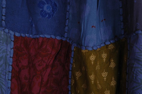 A gorgeous maxi skirt that reminds one of the beautiful Moroccan streets, this rayon skirt is truly one of a kind. With its assorted handmade patchwork, it is held together with a square dori that gives it a unique artisanal look. The patchwork is derived from various pieces of print fabrics leftover from mass garment production and then dyed in a particular color tone. This neutralizes the prints which are different on each piece. The underlying dyeing makes the skirt conform to a certain tone - as seen in the pictures for this style, here it is blue but a bit of a variation can be expected. The drawstring waist provides a much-needed comfort. You can pair this stylish skirt with a white shirt and sandals for an artsy look!