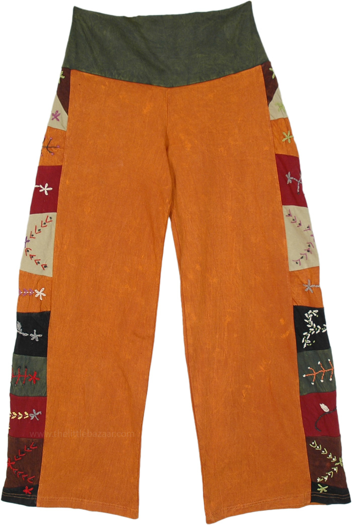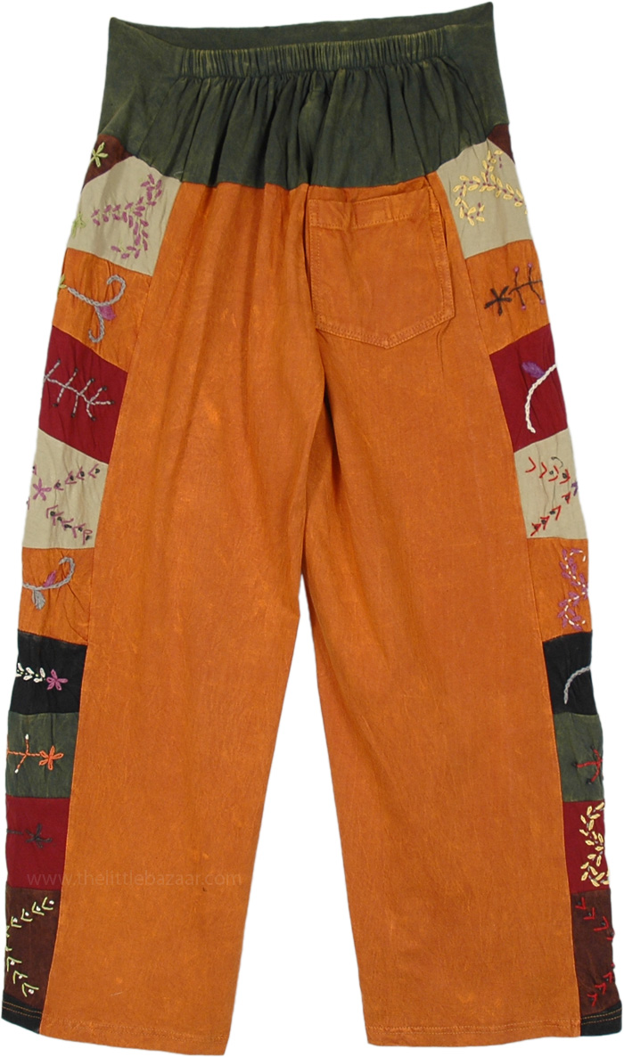 A cool hippie bohemian ribbed cotton straight pants in harvest-inspired colors (mainly piper to desert orange). These cool summer pants feature a flexible and comfortable yoga waist with half-elastic at the back and beautiful thread embroidery on various colored patches on the sides. The pants also have a velcro closure on the back pocket. These cotton pants are worn as a loose fit and are airy and comfortable. Since the product is entirely handmade, there may be slight variations in the given details, and the patch colors may differ slightly (the picture is representative but not exact). Pair it with a solid top to make it a comfortable fall outfit.
