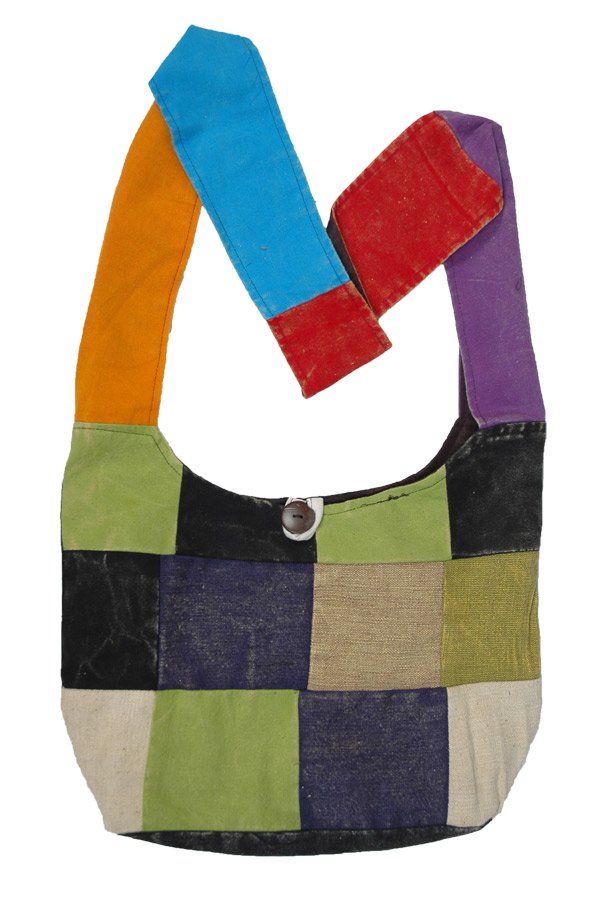 A statement bohemian style cross-body bag with patches of stonewashed multi-color cotton fabric sewn together. The bag is very unique as no patchwork bag is ever the same - but each piece has a similar look, by and large. The back of the bag is plain. At ten inches deep, it's not a very large bag, but just a cool smaller cross body or shoulder bag. There is a zipper and button enclosure to help keep all your things safe. There is also a zipper pocket inside the bag to help store small items. This stylish bag is perfect to carry around as an accessory at the beach or at a concert. Style it with a neutral outfit to make it stand out or let it add to the colors. Your choice!