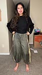A soft and lightweight bohemian harem pants in an ethnic floral print. These pants have fun elastic cuffed ankle and an elastic waist with a drawstring. These harem-style pants have a relaxed fit through thighs which makes them even more comfortable. The fabric is light, smooth and comfortable. Great for outdoors, beach or even a casual day out. Make a perfect street outfit by adding sandals and a hippie shoulder bag.