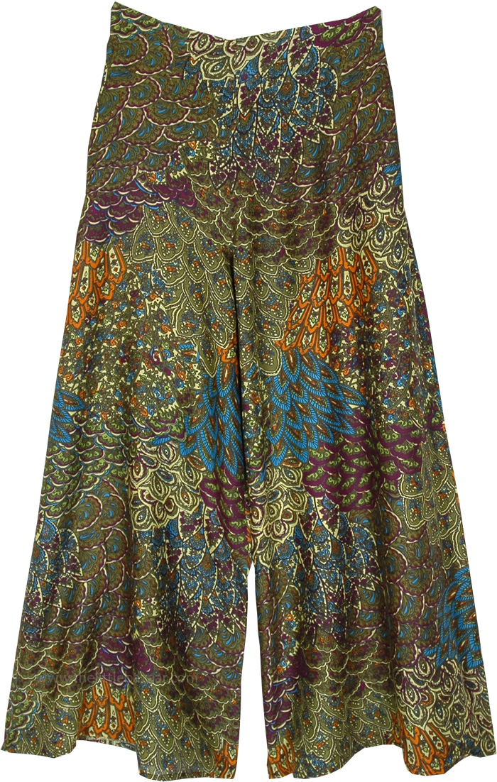 These satin-like rayon palazzo pants are chic yet incredibly comfortable. With a wide-leg style, it helps keep cool during the hot and humid summers. The elastic waist ensures comfortable sizing. The beautifully ornate print reminds one of a beautiful forest setting, with its green hues it is sure to fetch some compliments! Pair these pants with a matching green top to complete the look. You can wear this pair for outings, travels, and even the beach!