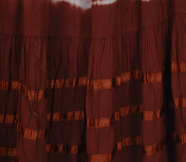 A uniquely tie-dyed skirt in ruby red with ribbons highlights