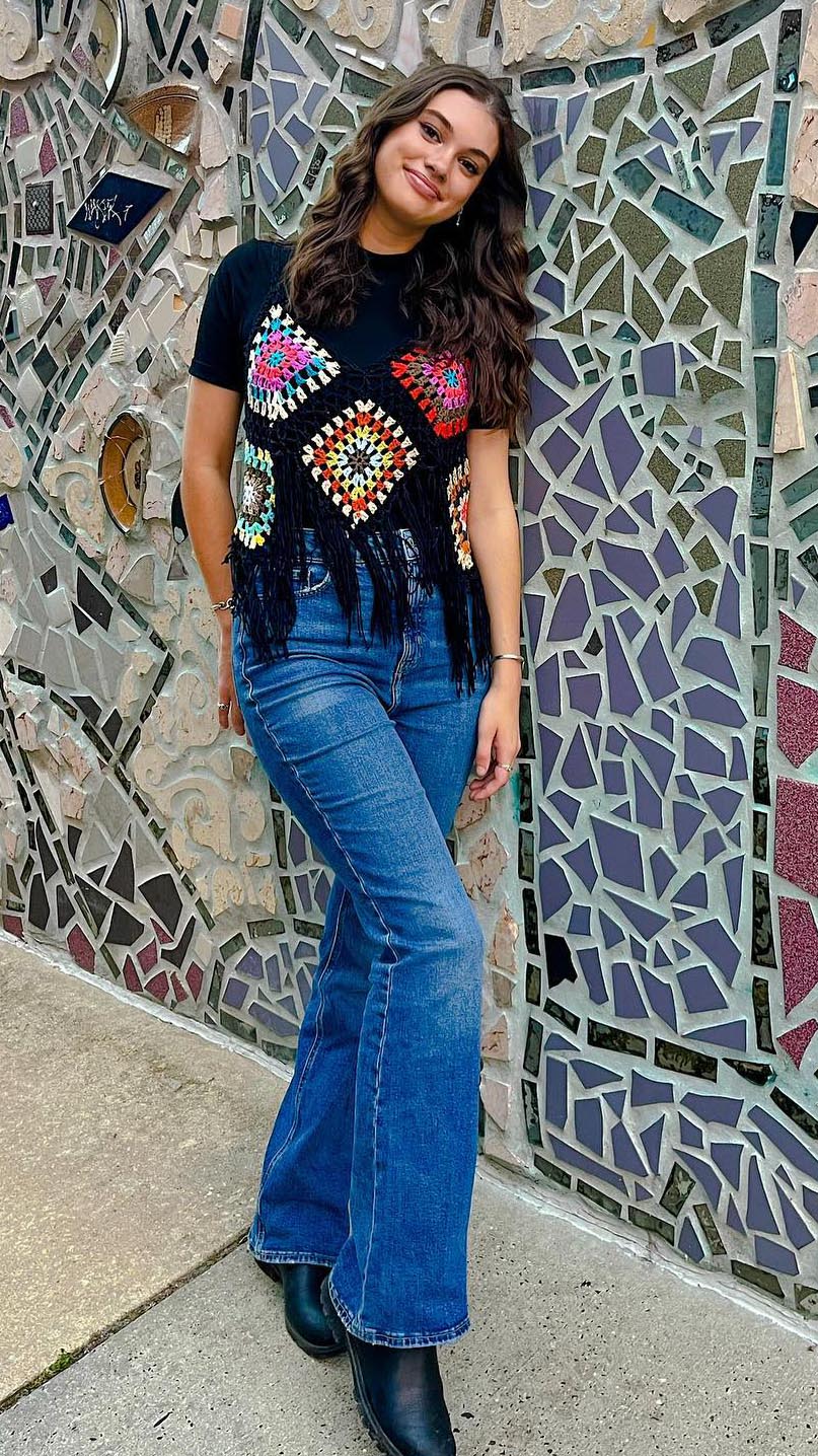 A gorgeous and delicate white crochet top with a splash of vibrant diamond pattern, this top stands out from the rest. A sleeveless style with the tasseled bottom is sure to keep you cool during the hot and dreary days. The soft fabric feels comfortable throughout the day and is the right fit for your summer wardrobe. Pair it with a pair of white jeans and loafers to give a nice contemporary look. You can wear this stylish piece with your friends, at the beach or even for festivals!.