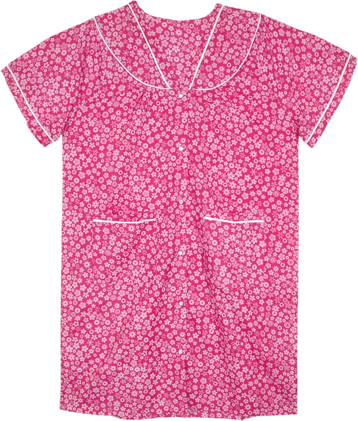 A cute pink floral printed snap-front duster house dress in a mixture of good quality cotton mix fabric. This lightweight dress is free-flowing and has snap button closing at the front. The dress has a V-shaped gathered yoke neckline and two pockets at the front. The neckline, pockets and sleeves are highlighted by white piping that looks adorable. This house dress is so soft and soothing to the skin that you can use it as a night dress or sleepwear. The overall loose-fit and free flowing construction makes it easy and comfortable to wear.