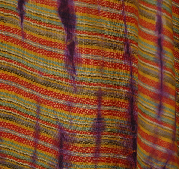 A comfortable and loose-fit pair of unisex drop crotch pants in a striped woven cotton fabric and purple tie-dye streaks details. The tie-dye accents are done by hand in complementing deep purple color. These pants come with a flexible elastic waist, jump legs, and two side pockets. These are also called wide-cut genie pants and they rock on almost any body type. The fabric feels soft and supple on your skin. These free-flowing baggy pants are comfortable to wear.