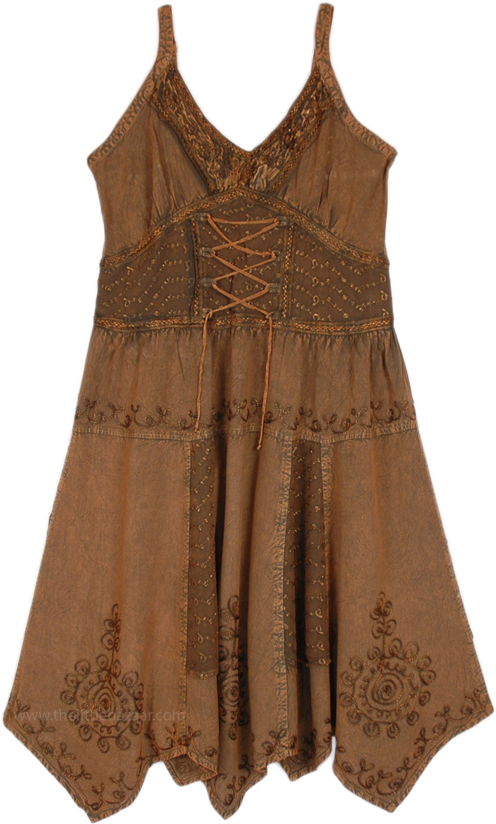 Autumn Brown Multi Panel Tank Dress with Embroidery and Spaghetti Straps