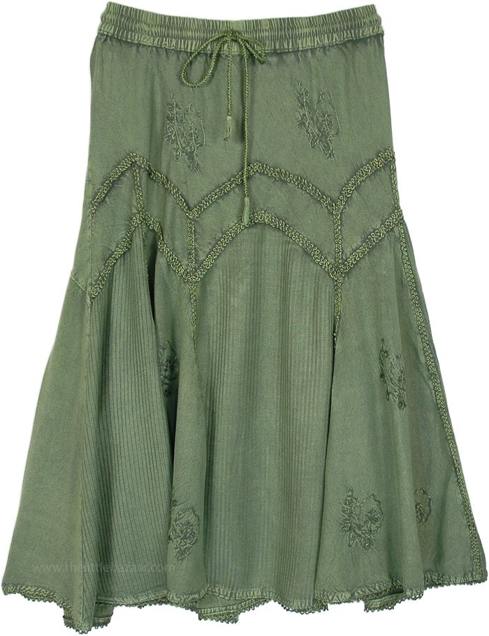 An understated and elegant long medieval-style olive green skirt with a beautiful addition of delicate embroidery and lace. Bring in the lush with this comfy rayon skirt, having an elastic waist with a drawstring for minor size adjustments. The skirt has detailed embroidered motifs on the front, and overall, the skirt drapes in a very feminine fairycore manner. The skirt can be worn in a casual or a formal style with the right accessories- for a laidback casual look, pair it with a t-shirt and wedges; for a more formal look- pair it with a satin blouse and heels.