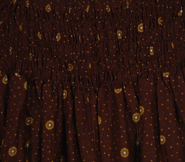A free-flowing ethnic peacock bronze feather printed rayon harem pants with smocked waist and elastic bottom. These comfy pull-on pants feature two functional front pockets. The smocked yoke and soft construction provides a comfortable and flattering fit. The ethnic print adds to the versatility and style, allowing them to be paired with a solid casual or fancy top and bold accessories. Perfect for anything from yoga and meditation to a beach vacation - these wonderful pair of pants are fun to own and wear.