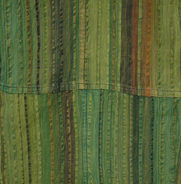 A slightly shorter version soft and beautifully textured, breathable stonewashed cotton trouser pants that are made from patches of striped fine quality fabric in shaded green. These straight-leg trousers have two side pockets and a back pocket; the waist has elastic and a drawstring for flexibility. These easy to wear, loose fit, casual summer trousers are made from handloom cotton - seersucker and breathable casual pants; ideal for lounging, yoga, and travel.