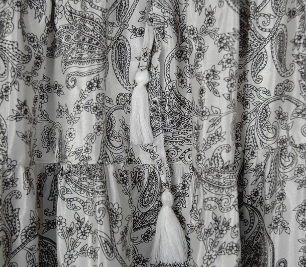 A monochrome soft and soothing short skirt with three tiers of lightweight fabric. This skirt has ethnic paisley and floral prints all over the fabric, with a frilled bottom. The elastic waistline allows for a comfortable fit, and the tassel drawstring adds charm. This knee-length skirt has no lining and is an easy choice for a fun day out. You can pair it with a solid t-shirt or a tank top; add classy, metallic, urban jewelry to complete the summer look. Flatter your body with the fit and flare of this stylish short skirt.