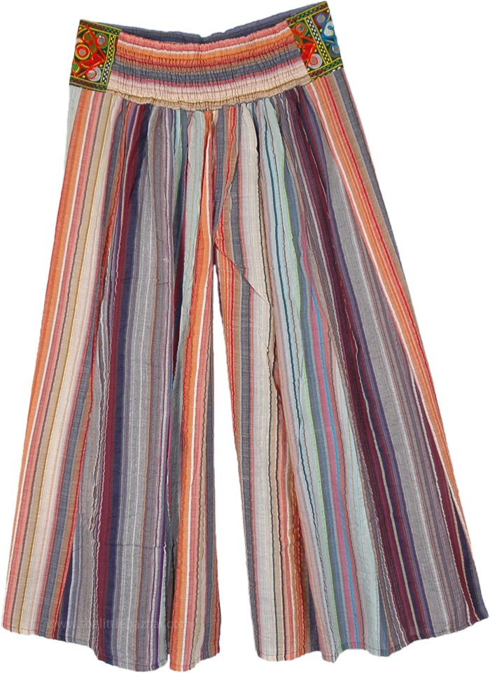 A multicolored wide-leg striped pants in a seersucker cotton fabric. These festive-style hippie pants' most attractive feature is their waist, which has embroidery and mirror details. The back of the waist is half-elastic ensuring a comfortable fit; the waistband is broad enough to provide you all-day comfort. There's also a pocket on the top right with a flap on the front for small stuff like bills, credit cards, licenses, etc. These loose-fit wide-leg striped pants will fit large to extra-large sizes. They can be paired with a variety of tops that you can wear on different occasions. The pants are fitted at the waist and flow beautifully downwards.