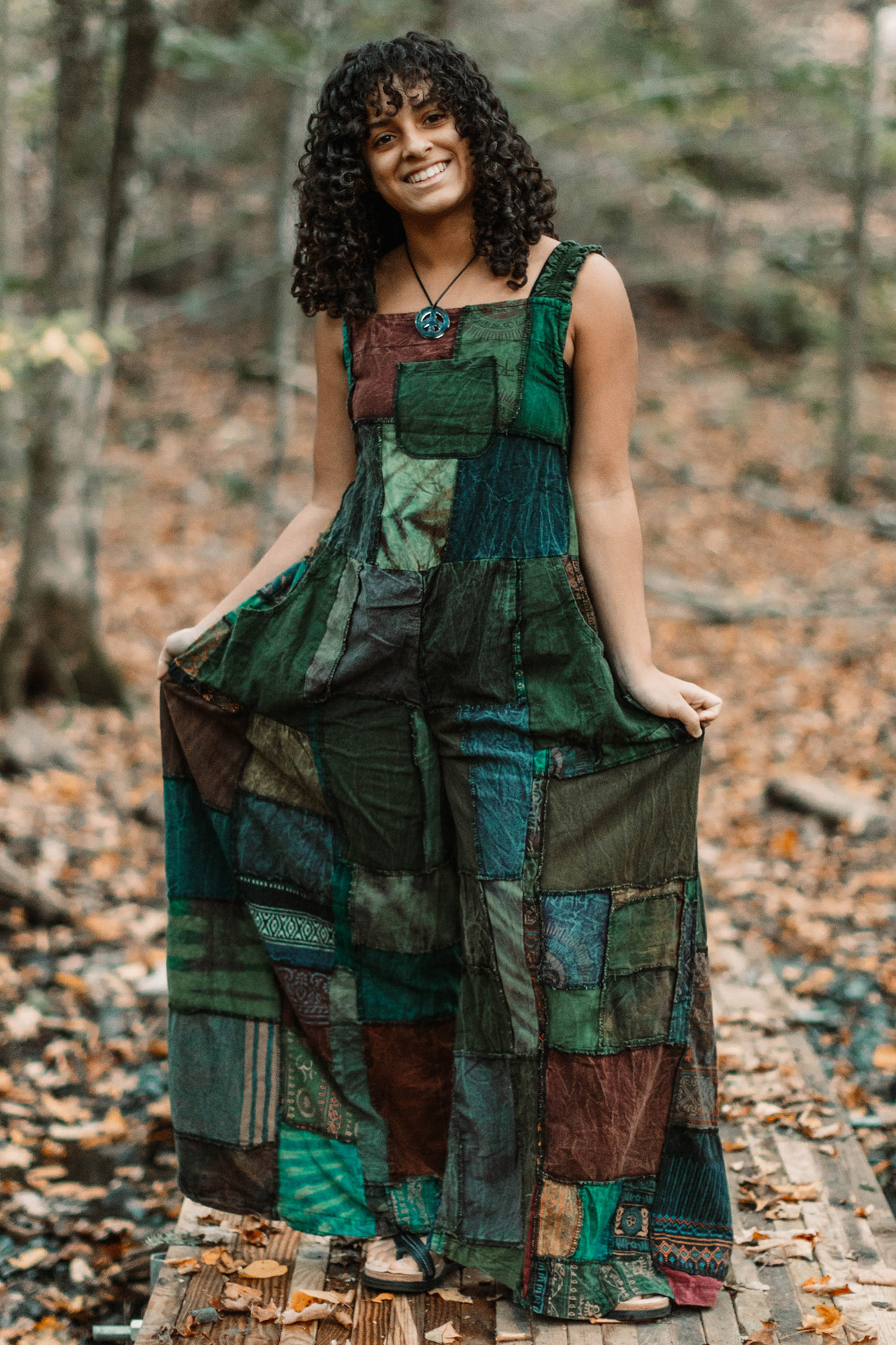 A unique wide-leg cotton jumpsuit featuring "Om" symbols and inscriptions. The jumpsuit features a patchwork of multicolors such as green, pink, red, etc. in a cross-stitch pattern overdyed in orange tone. They feature a pretty wide-leg style construction and adjustable elastic shoulder straps with 3 loops for buttons at 4 inches apart; so, you can adjust the length as per your height. They also feature elastic smocking at back to adjust the waist. Stand out from the crowd with these stylish, yet comfy cotton overalls. You can wear them with a simple tank top, t-shirt, or turtleneck underneath. Wear it out for festivals, outings or vacations, it is truly a style statement piece.