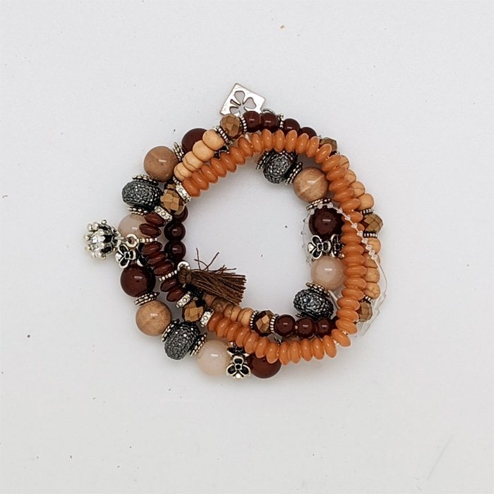 A brown, beige, silver multi-strand bracelet or multi-layer bracelet of four separate pieces connected by a loop. This multi-strand wrap bracelet is decorated with tiny gemstones like beads. Beautiful brown gradient beads make this string bracelet a true companion for any matching bohemian outfit!