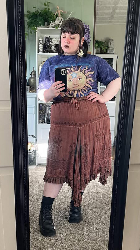 A renfaire aesthetic brown skirt with soft fabric, amazing quality, and a renaissance high low design! This western country maxi skirt in rayon is highlighted by fine embroidery and a georgette flared panel on the hem. It is stitched in layers that become fuller with each tier, each tier has an individual embroidered design with a ruffled handkerchief bottom style. This skirt is full and flowing with an elastic waist and drawstring. The front lacing enhances fit and the yoke of the stylish medieval skirt is accented with lace fabric for a Gothic look. You can create several unique outfits with this same skirt by pairing it with a bralette or a tank top, a shawl, a shag sweater or a jacket. Easily create a brown country or forstcore look! Available in three sizes.