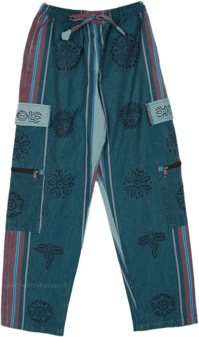 These are unique pants featuring two separate box pockets on each leg, one with a flap closure and the other with a zipper. Together with two side pockets and one back pocket, there are a total of seven pockets, making for a great hippie style. The hand-loomed cotton (called shamma cotton) loose-fit pajama-style trousers are apt for reflecting a Bohemian look while staying comfortable. The stonewashed fabric is accentuated with block printing. The elastic and drawstring on the waist provide for size flexibility. The material is absorbent and pure cotton, apt for any day - these pants are a good fit anywhere where the hippie aesthetic is in the air. These long bohemian pants work well for both men and women.