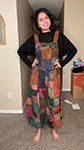 A unique harem style cotton jumpsuit featuring "Om" symbols and inscriptions and closed with an elastic at the ankle. The jumpsuit features a patchwork of multicolors such as browns, green, purple, etc. in a cross-stitch pattern, overdyed in brown. They feature a balloon-style leg construction and adjustable elastic shoulder straps with 3 loops for buttons at 4 inches apart; so, you can adjust the length as per your height. They also feature elastic smocking at back to adjust the waist. Stand out from the crowd with these stylish, yet comfy cotton overalls. You can wear them with a simple tank top, t-shirt, or turtleneck underneath. Wear it out for festivals, outings or vacations, it is truly a style statement piece.