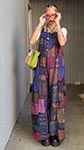 A unique wide-leg cotton jumpsuit featuring "Om" symbols and inscriptions. The jumpsuit features a patchwork of multicolors such as browns, green, purple, etc. in a cross-stitch pattern, overdyed in brown. They feature a pretty wide-leg style construction and adjustable elastic shoulder straps with 3 loops for buttons at 4 inches apart; so, you can adjust the length as per your height. They also feature elastic smocking at back to adjust the waist. Stand out from the crowd with these stylish, yet comfy cotton overalls. You can wear them with a simple tank top, t-shirt, or turtleneck underneath. Wear it out for festivals, outings or vacations, it is truly a style statement piece.