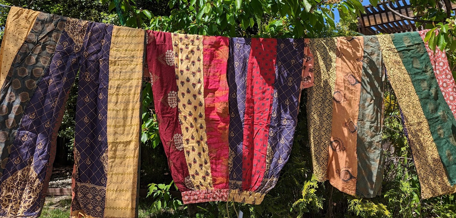 Each paid of pants has unique Longitudinal patchwork panels but dyed in the same color; each piece is unique;