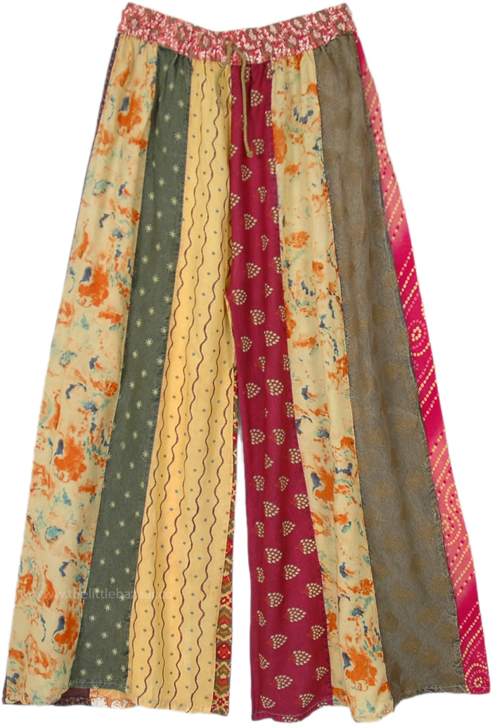 Washed Rayon Elastic Waist Pants with Assorted Bohemian Vertical Patchwork